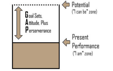 | All of us have a GAP between what we can be and what we are. This GAP has been commonly called the Potential-Performance Gap. The top dotted line indicates our potential (the "I can be" zone) and the bottom solid line indicates our present performance (the "I am" zone). The space between these two lines is the GAP between what I am and what I can be. The key to closing this gap is found in the acronym itself: |